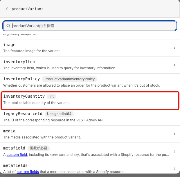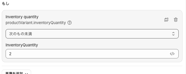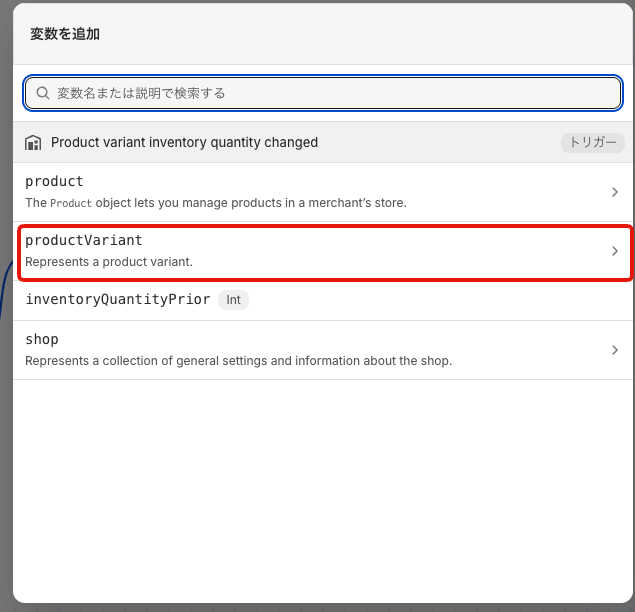 「 productVariant」を選択を選択すると下記の選択条件リストが表示されるので、「 Inventory quantity」を選択します。