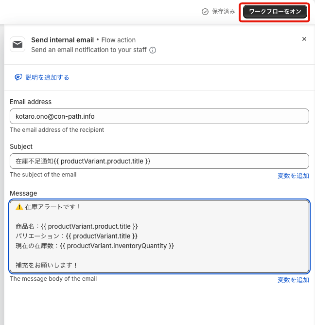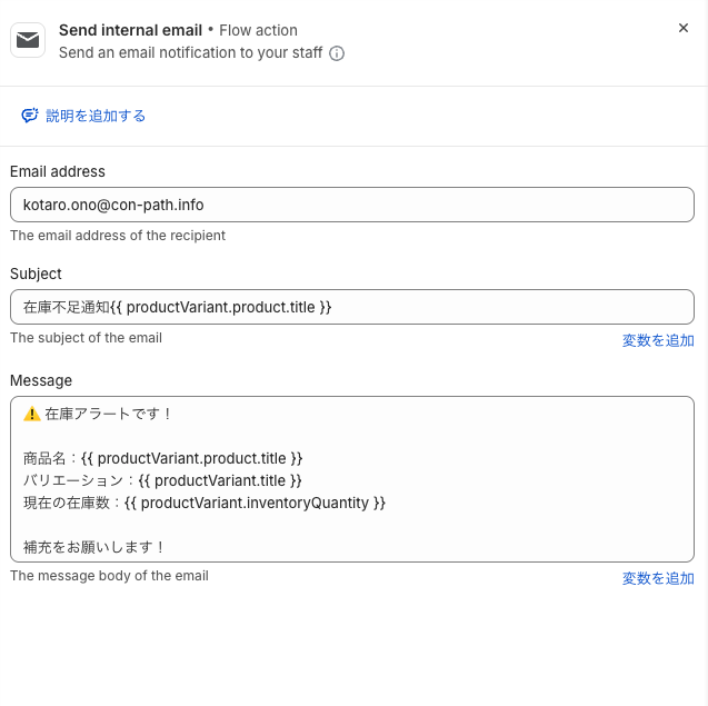 Shopify Flowで「在庫不足アラートメール」を設定する手順