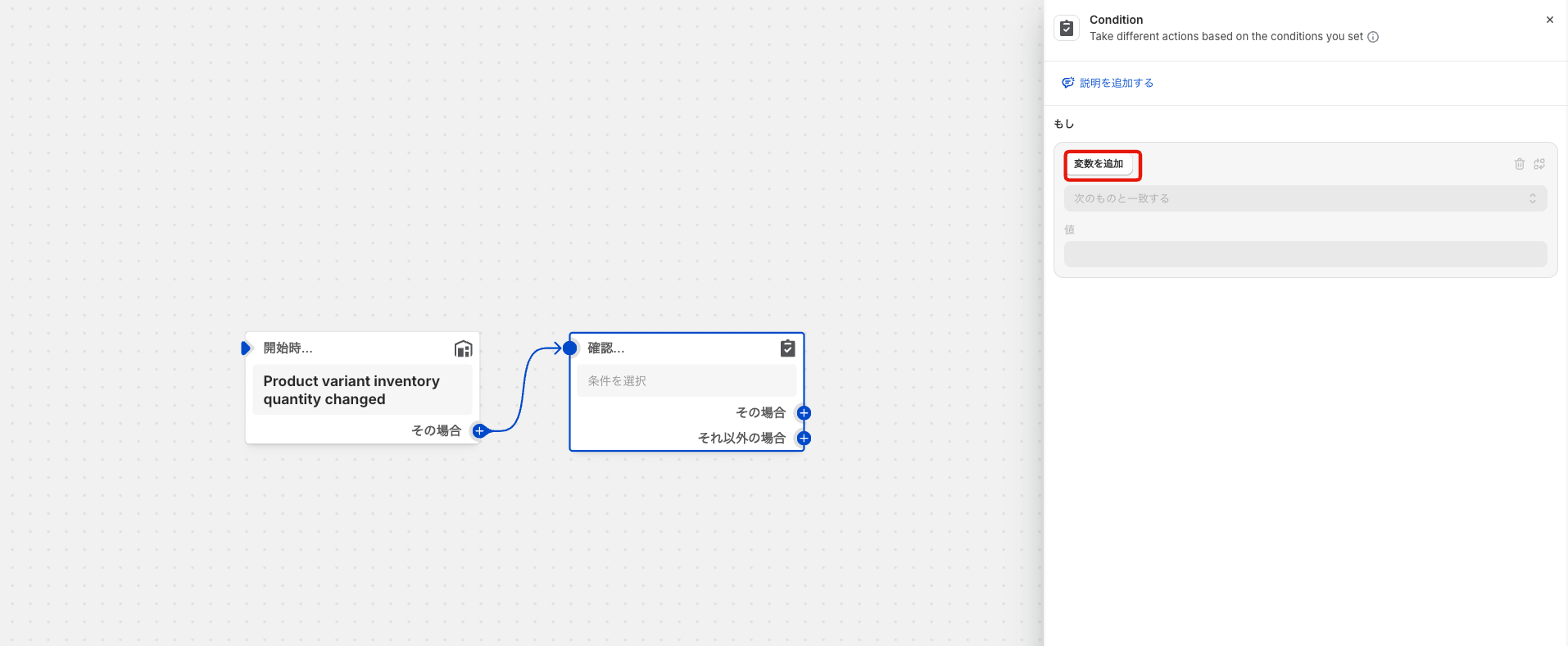 「条件」を選択すると下記の画面が出るので「変数を追加」を選択します。